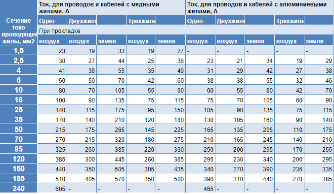 Ампераж По Сечению Кабеля Таблица