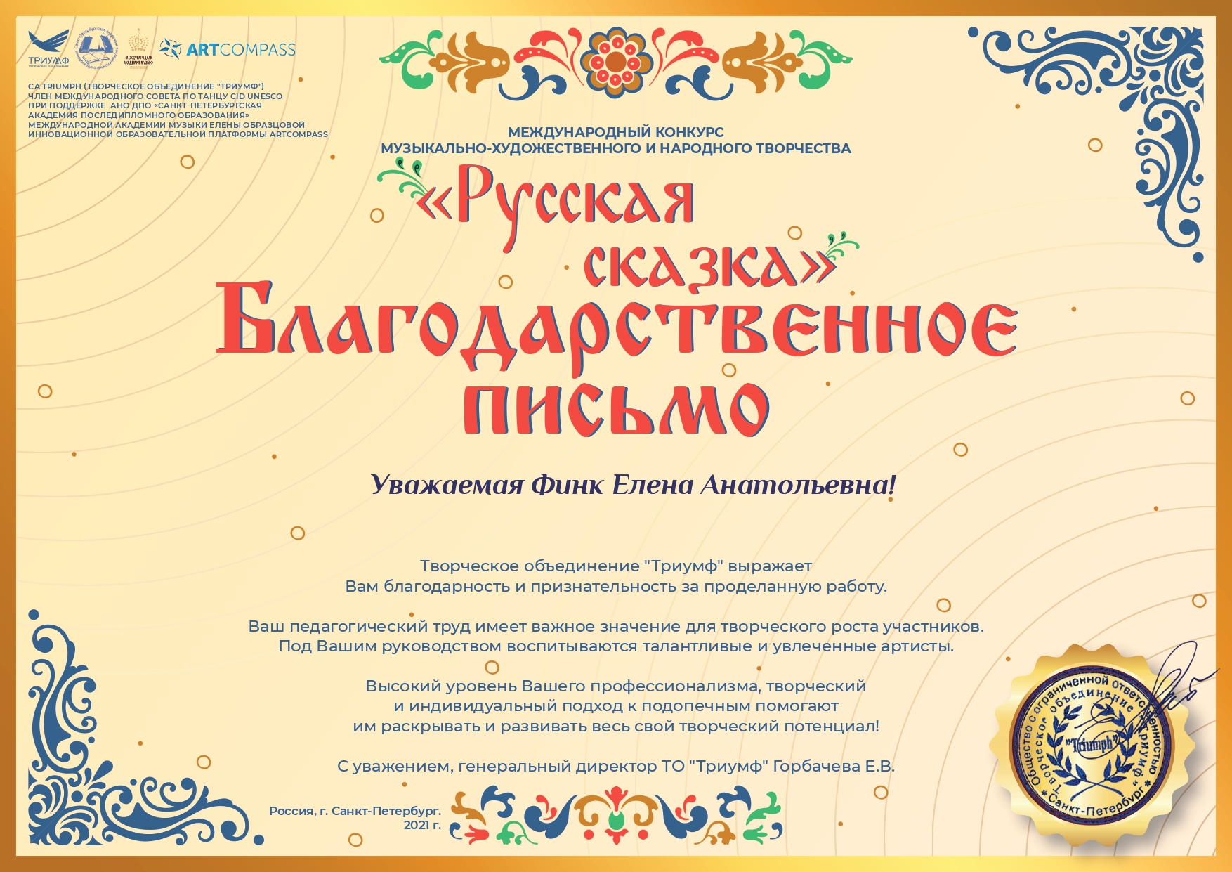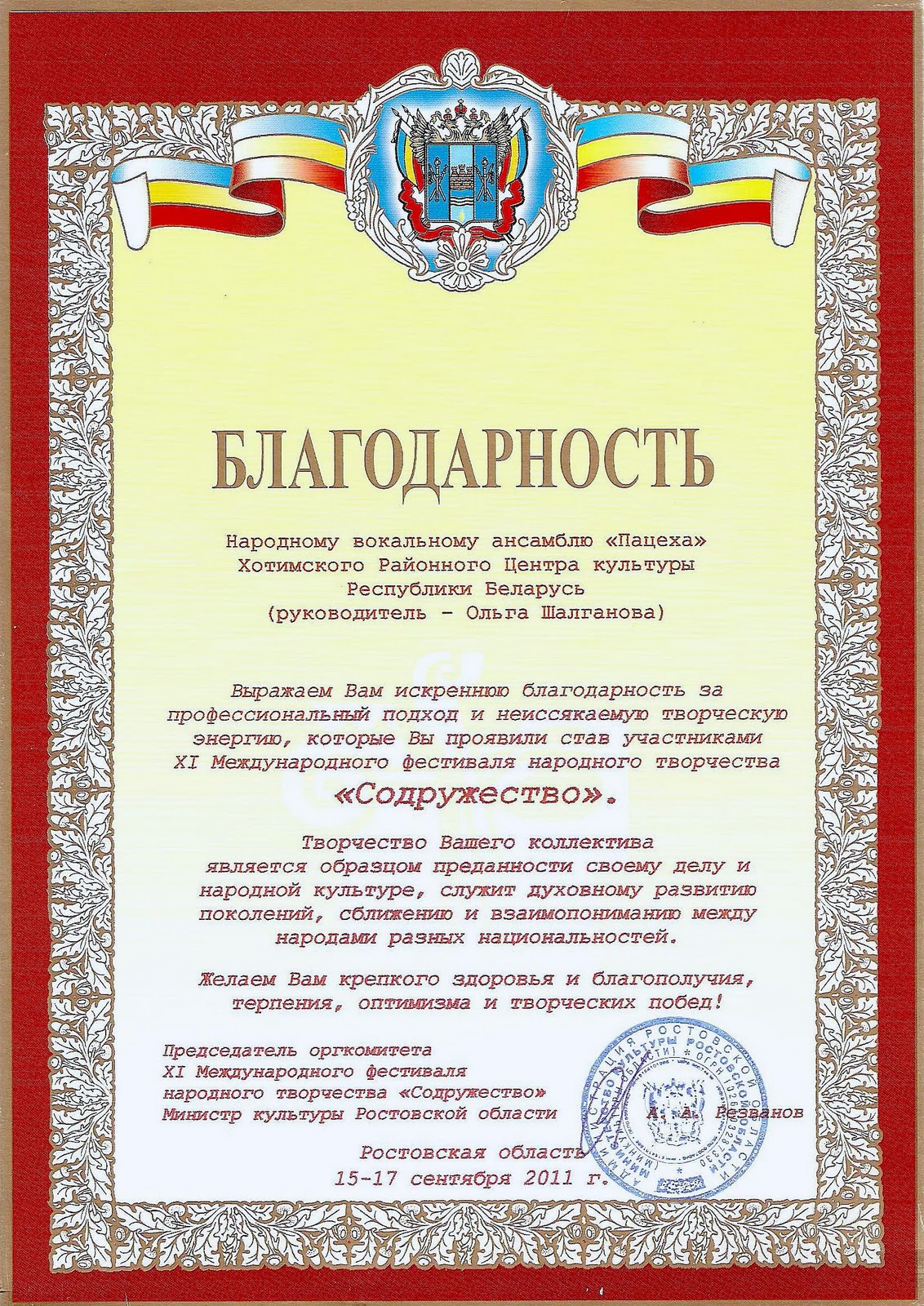 Благодарность Фольклорному Ансамблю