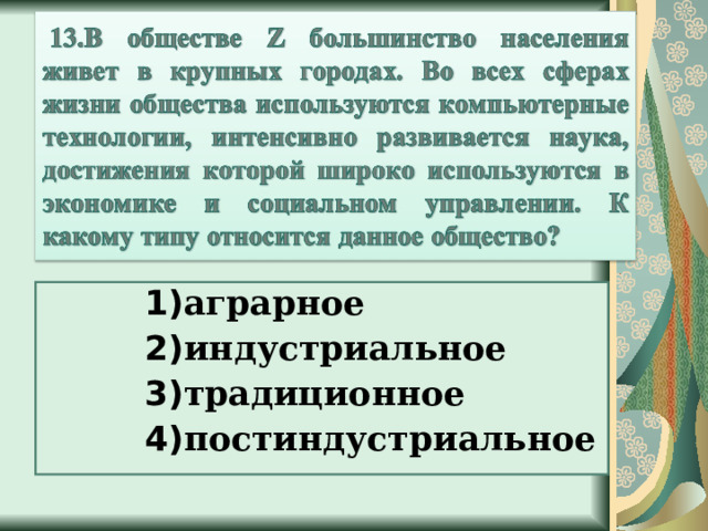 1 Индустриальному 2 Традиционному 3 Аграрному 4 Постиндустриальному