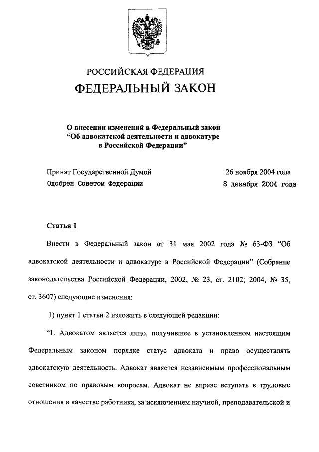 Федеральный Закон Об Адвокатской Деятельности И Адвокатуре В Российской Федерации Был Принят В Году